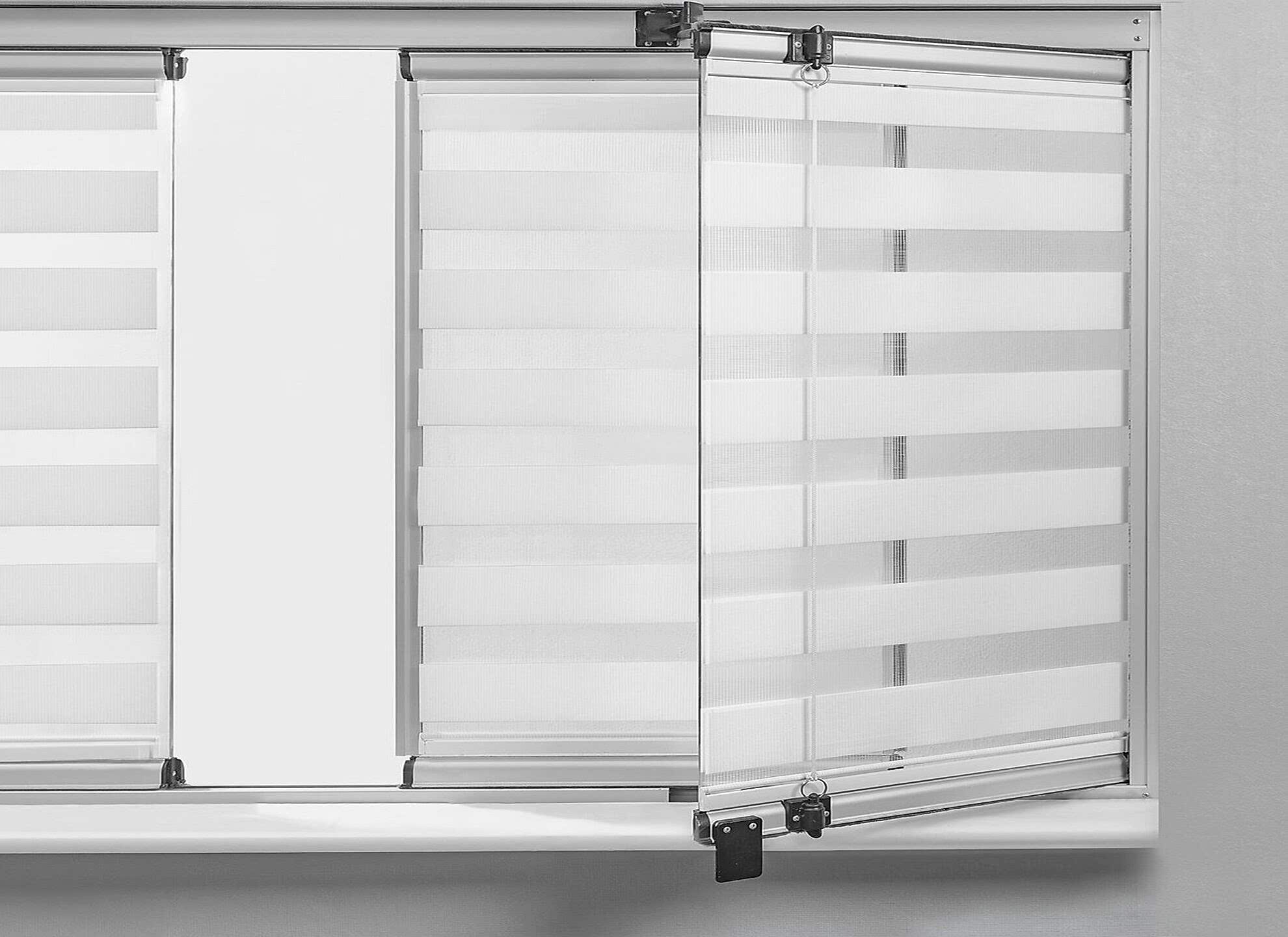 - Gündüz ve Gece Kullanımı; Zebra perdeler, diğer perdelerin aksine hem gündüzleri hem de geceleyin kullanılabilirler. İki farklı kumaş şeridi arasında açık ve kapalı bölgeler bulunur, bu sayede hem ışığı yumuşatır hem de mahremiyeti artırır.